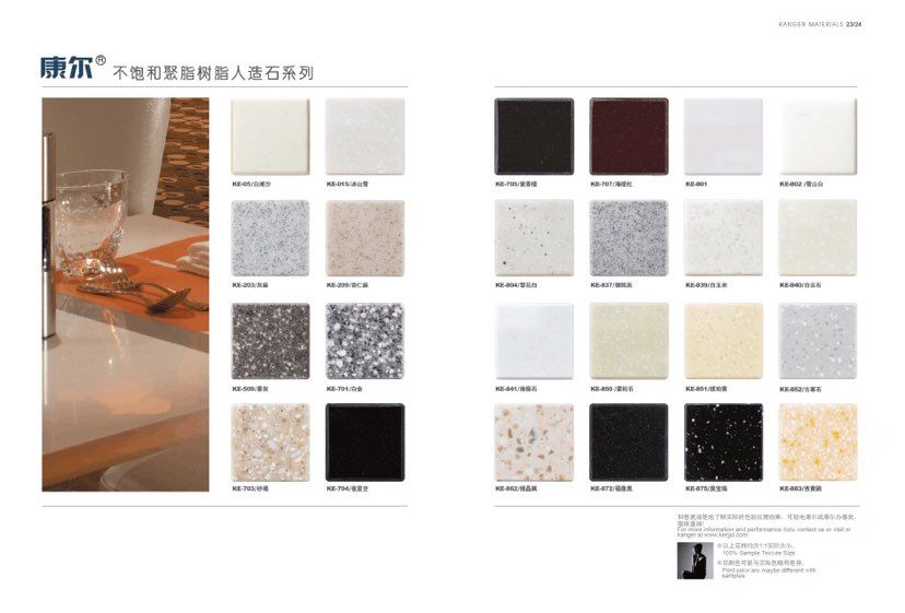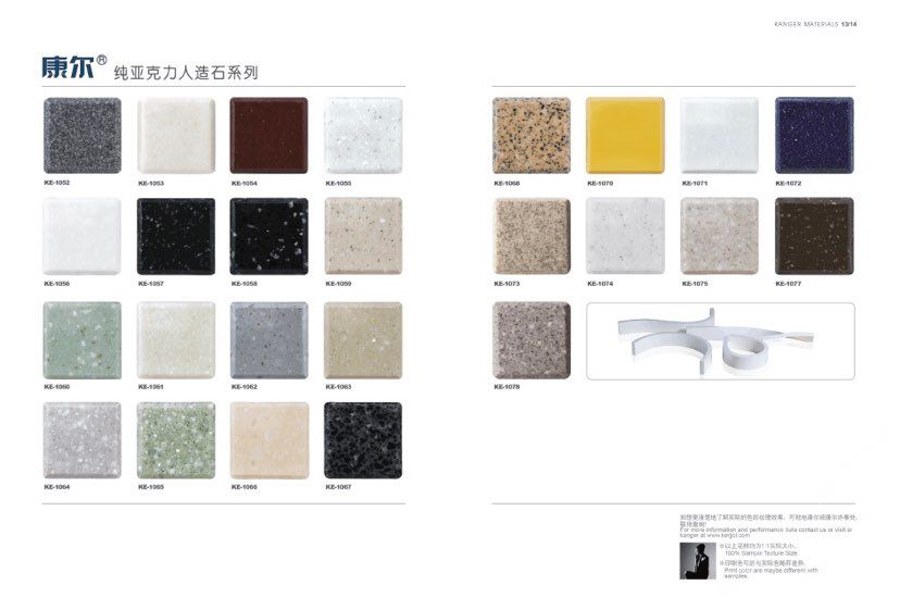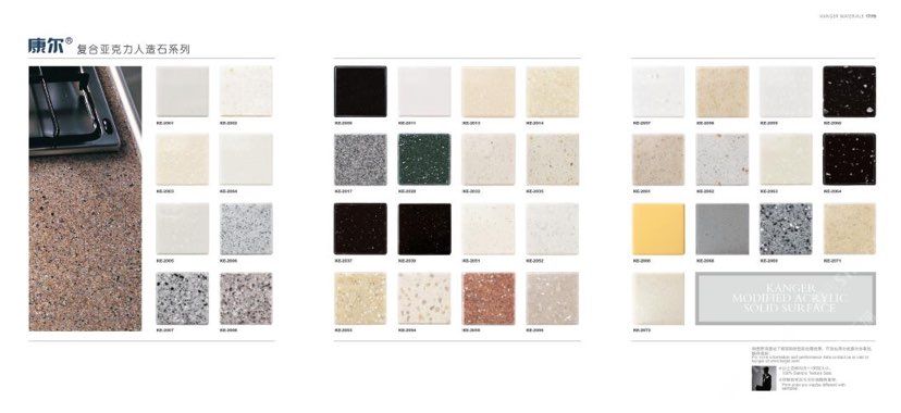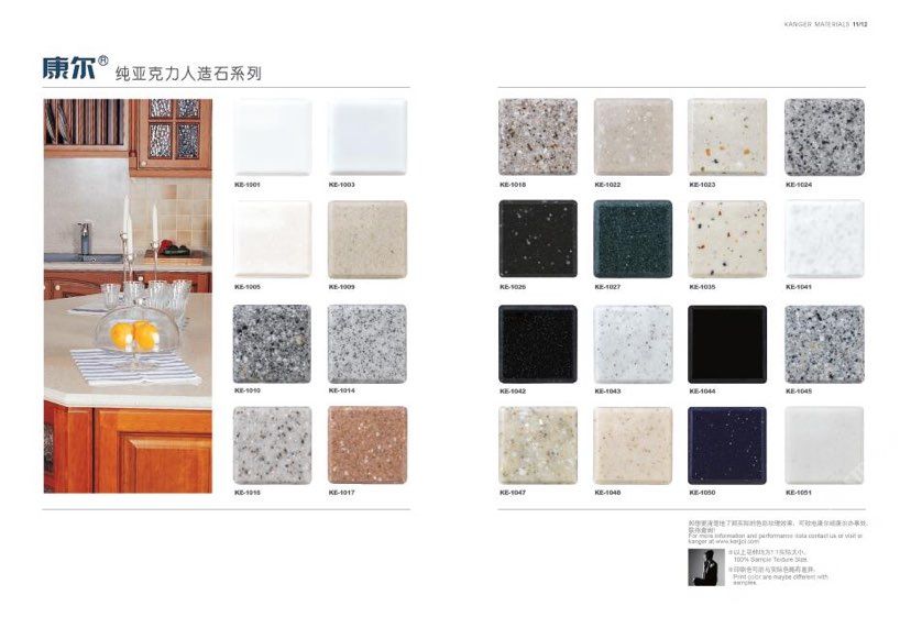 康爾人先后開發(fā)出了色彩豐富的 100% 純亞克力系列,復(fù)合亞克力系列,不飽和樹脂系列,石英石、集成成品臺面和高分子復(fù)合材料門板系列。產(chǎn)品系列多樣、顏色豐富、品質(zhì)穩(wěn)定、已銷往世界幾十個(gè)國家,深受國內(nèi)外客戶的好評.