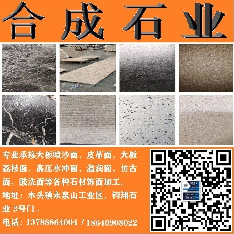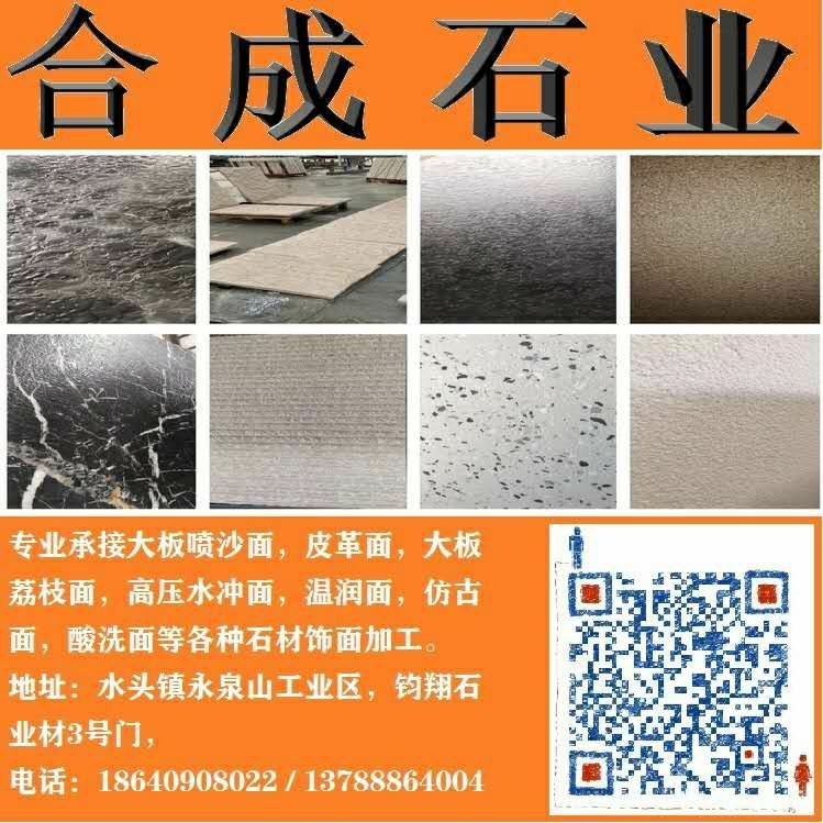 專(zhuān)業(yè)承接皮革面、溫潤(rùn)面、噴沙面,鋼砂面、高壓水沖面,大板荔枝面,絲綢面,溫潤(rùn)面,磨砂面,布紋面,斧鑿面(龍眼面),仿古面等各種飾面加面