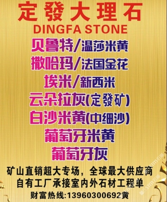 發(fā)布信息: 貝魯特/溫莎米黃,工程外墻干掛? 葡萄牙米黃/葡米,工程外墻干掛★ 撒哈瑪/法國金花,室內(nèi)外材料?? 埃米、新西米,超白低室內(nèi)外材料★ 云朵拉灰,專為工程而打造,超性價比 白沙米黃/中細(xì)沙,室內(nèi)外材料?? 令每個工程交付,做到驗收無憂???? (質(zhì)與量的保障者、經(jīng)得起層層考驗)???? 全球供應(yīng)商,各大地產(chǎn)指定供應(yīng)商? 承接國內(nèi)外室內(nèi)外石材工程訂單???? 致富專線:13960300692黃