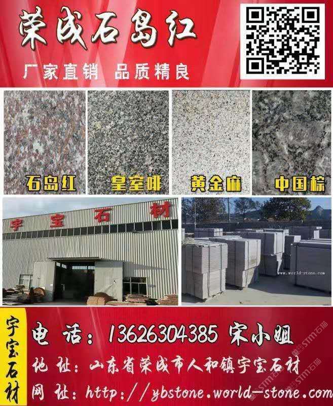 發(fā)布信息: 山東榮成市宇寶石材廠家直銷:皇室啡、石島紅8#、黃金麻,石島蝦紅(新品)、皇室珍珠、皇室玫瑰、皇室棕鉆、紫晶鉆、榮成灰、威海白麻、黃金麻等系列毛板,工程板,蘑菇石及臺階石異型石材產品。另有大量地鋪庫存拋售。真摯邀請新老客戶,來廠實際考察,一次合作,為友 。請加好友,找一個合適的廠家不容易,找一個可以長期合作的廠家更不容易,以防備用。電話:13626304385微信號同手機號13626304385