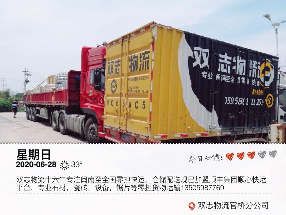 發(fā)布信息: 水頭雙志物流十六年專注閩南至全國(guó)零擔(dān)快運(yùn),現(xiàn)已加盟順豐集團(tuán)順心快運(yùn)平臺(tái),專業(yè)石材、瓷磚、設(shè)備、鋸片等零擔(dān)貨物運(yùn)輸。本物流專線福建到全國(guó)各地線路零擔(dān)整車 運(yùn)輸業(yè)務(wù),零擔(dān)隨時(shí)上門提貨,天天發(fā)車,價(jià)格合理!專注全國(guó)石材瓷磚配件零擔(dān)直達(dá)快運(yùn)及閩南地區(qū)同城零擔(dān)配送一日達(dá),順豐集團(tuán)順心平臺(tái)各種零擔(dān)貨物10公斤起收,電商平臺(tái)入倉(cāng),大件送貨上樓,全國(guó)無(wú)盲區(qū),十六年專業(yè)值得您的托付!公司秉承客戶至上,服務(wù)的理念! 歡迎各位新老朋友來(lái)電洽談! 手機(jī)微信同號(hào):13505987769/15905908260李(女士)