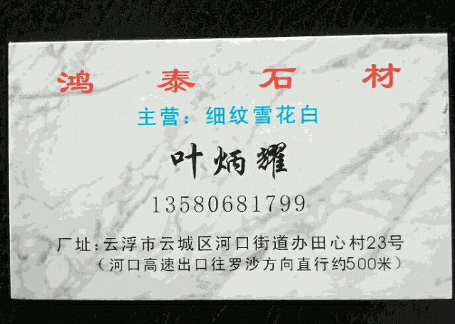 云城區(qū)鴻泰石材 聯(lián)系人:葉生    135****1799 查看 手機(jī)號(hào)碼:無(wú) 主營(yíng)范圍: 大板批發(fā)、 企業(yè)地址:廣東云浮云城區(qū)河口街道辦田心村23號(hào)