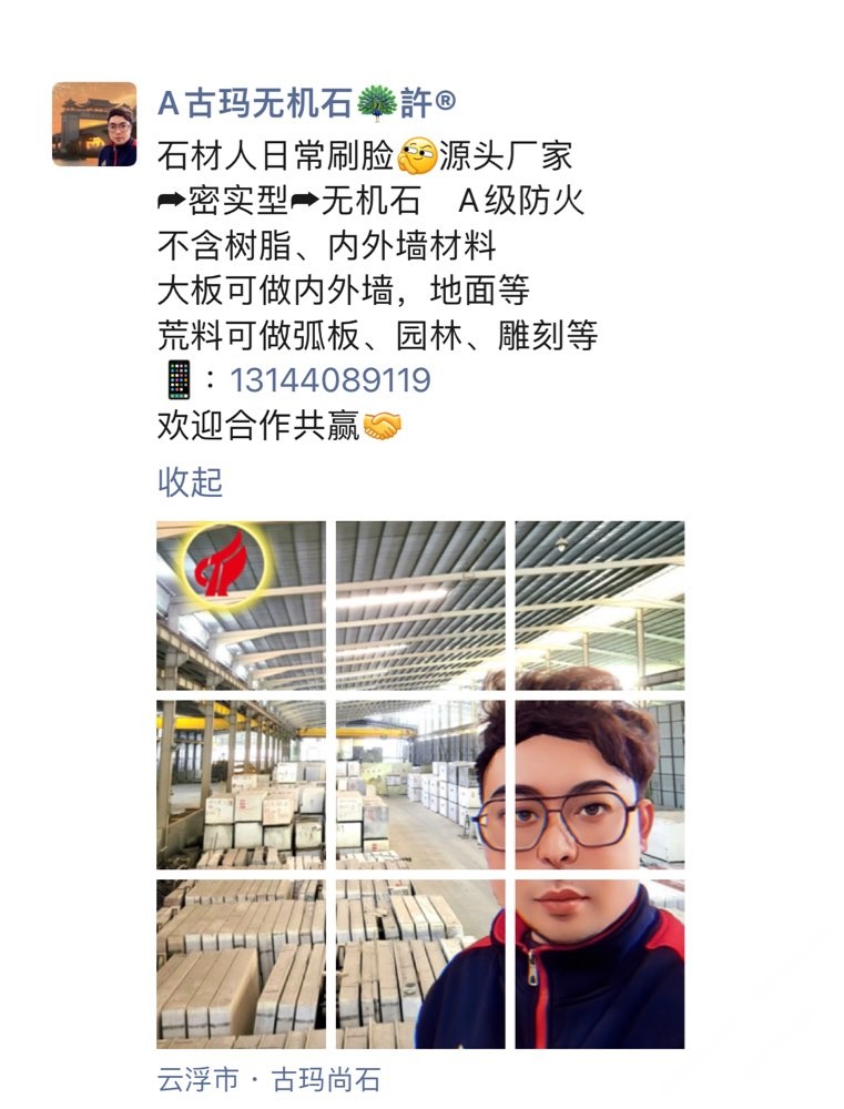 石材人日常刷臉[社會社會]源頭廠家 ?密實(shí)型?無機(jī)石A級防火 ?不含樹脂、?內(nèi)外墻材料 大板可做內(nèi)外墻,地面等 荒料可做弧板、園林、雕刻等 ??:13144089119 ?歡迎合作共贏[握手]