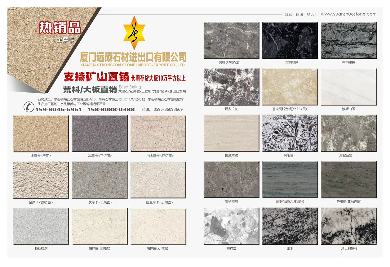 廈門遠碩石材進出口有限公司 聯(lián)系人:王先生    158****0388 查看 0595-****3669 查看 主營范圍: 大板批發(fā)、荒料、礦山、石材外貿(mào)、異型加工、大理石加工、石材工程資質(zhì)企業(yè)、薄板復合板加工、物流、水刀拼花、 企業(yè)地址:福建南安水頭鎮(zhèn)海西石材城海西五路A16、A17