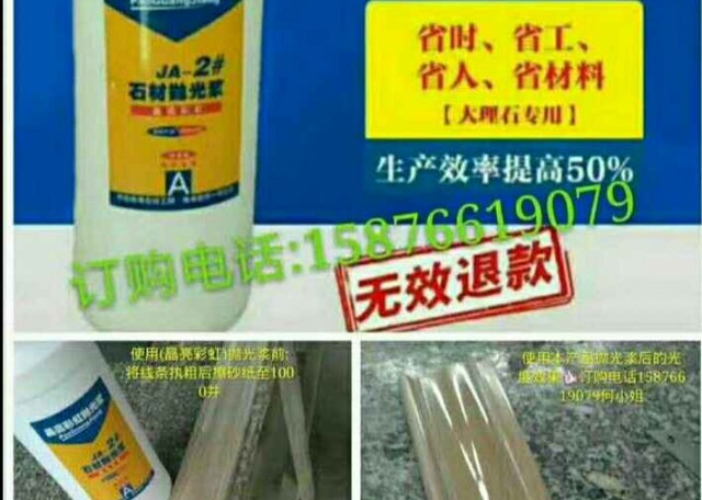 發(fā)布信息: (晶亮彩虹拋光漿)是摻進(jìn)納米顆粒的一種石材拋光漿,產(chǎn)品可滲透進(jìn)石材內(nèi)部形成?;?。 拋光漿使用方法: 1、用(晶亮彩虹拋光漿)擦線條時,先用600砂紙?jiān)诰€條上搓幾下,(如果線條磨到3號就不需要用砂紙搓,直接用拋光漿搓,就可以很亮了。) 2、使用前把瓶子倒過來,用力上下?lián)u,讓產(chǎn)品融合在一起。 3、再用半干濕毛巾或布沾本品用力來回搓個40秒。(要用點(diǎn)力搓) 4、搓完用另一塊干凈布或毛巾(一定要半干濕的)擦干凈即可。(要一氣呵成)(不用打蠟)擦完后立馬晶瑩透亮,形成?;妫粫祲A,不易退光,光澤度可保持二年。 溫馨提示: 如有打過蠟的必須先把蠟用砂紙搓掉再使用拋光漿擦! 請戴上防水手套操作??! (晶亮彩虹拋光漿)[玫瑰][玫瑰]