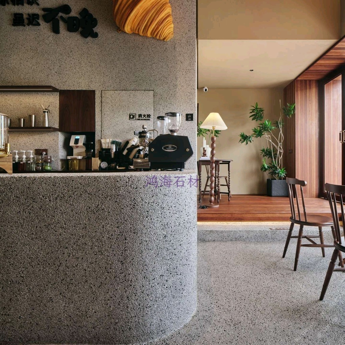發(fā)布信息: 咖啡店設(shè)計干貨|水磨石 木格柵的組合 一進(jìn)門就被水磨石打造的吧臺狠狠洗衣,顆粒感的肌理搭配溫潤的木質(zhì)吊柜,觸感和視覺的碰撞真的太妙了~ 墻面的“與你相識雖不晚”直接戳中內(nèi)心,旁邊的巨型可頌裝置既是裝飾又點明了品類,細(xì)節(jié)感拉滿。 動線設(shè)計也很舒服,點單區(qū)和取餐區(qū)劃分清晰,哪怕人多也不會覺得擁擠,把功能性和美學(xué)平衡得恰到好處。