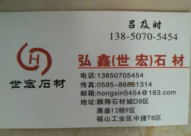 世弘石業(yè) 聯(lián)系人:呂先生    138****5454 查看 135****9039 查看 主營范圍: 大板批發(fā)、 企業(yè)地址:福建泉州輝盛大板市場B區(qū)-4 萬和石材